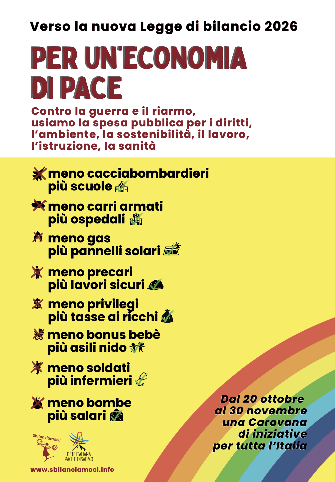 “Lo scopo dell’iniziativa della Carovana – affermano Giulio Marcon, portavoce di Sbilanciamoci! e Sergio Bassoli, coordinatore della Rete Pace e Disarmo – è di contrapporre alle scelte di riarmo le alternative di un’economia di pace fondata sulla sostenibilità, il lavoro, i diritti, la giustizia sociale, la lotta alla povertà”.