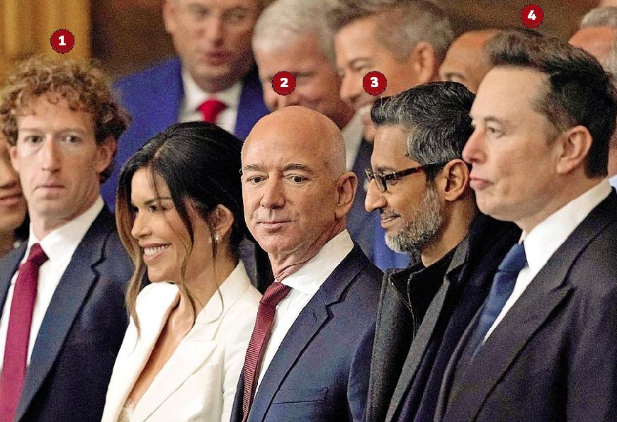 Questa oligarchia tecnologica attorno al presidente Trump si è plasticamente schierata in parata durante la sua cerimonia di insediamento. Così, dalle immagini di quel momento, simbolicamente rilevante, si individua in prima fila la foto di gruppo con Mark Zuckenberg (Meta-Facebook-Meta-AI) che pure sta investendo molto in progetti di Intelligenza Artificiale, Jeff Bezos (Amazon, Blue Origin, AWS), Sundar Pichai (Google, Gemini), allineati accanto ad Elon Musk (Tesla, X-Twitter, Space-X, X-AI): tecnoimprenditori che messi insieme sommano mille miliardi di dollari di patrimonio, risultano tutti attivi nello stesso campo, quello della Intelligenza Artificiale e dei social media. Interessati come sono a sviluppare sistemi e servizi tecnologici che qualche anno fa era normale pensare come di esclusiva competenza statale (si pensi ad esempio all’esplorazione spaziale o allo sviluppo di reti satellitari per la telecomunicazione). Meno esposti, ma anch’essi presenti alla cerimonia, Tim Cook di Apple e Sam Altman di OpenAI, mentre Bill Gates, fondatore di Microsoft, dopo una visita a Mar-a-Lago ha immediatamente espresso dichiarazioni positive verso l’impostazione del presidente repubblicano appena tornato in pedana.